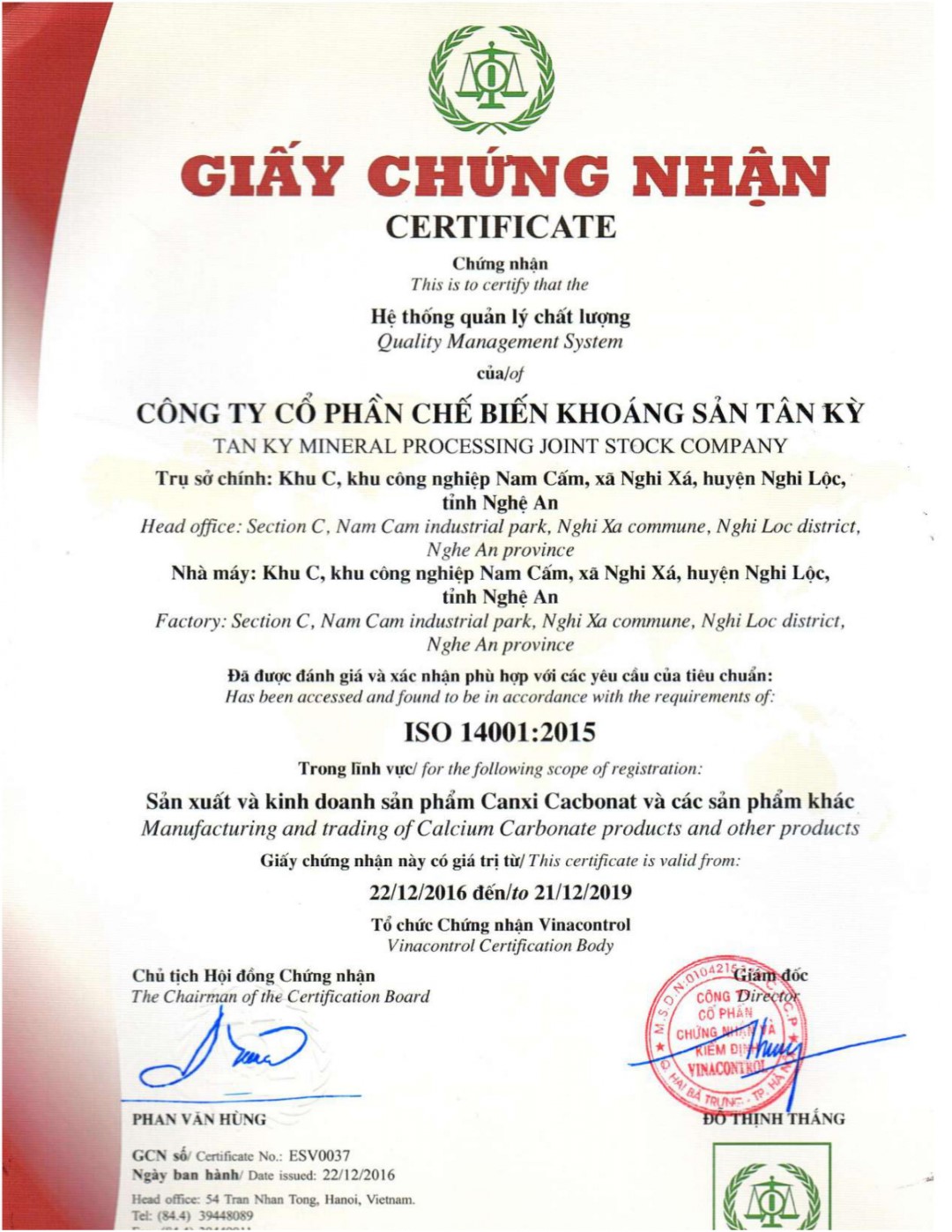 Vào tháng 12/2016, Công ty cổ phần chế biến khoáng sản Tân Kỳ đã được đánh giá và xác nhận phù hợp với các tiêu chuẩn ISO 9001 : 2015 và ISO 14001 : 2015 trong sản xuất và kinh doanh sản phẩm Canxi Cacbanat cùng các sản phẩm khác.