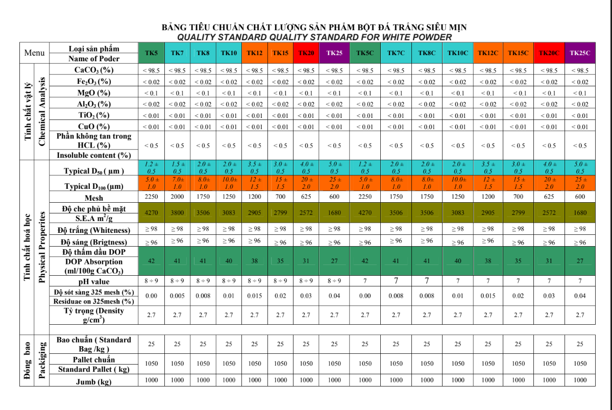 Ảnh bảng tiêu chuẩn chất lượng sản phẩm bột đá trắng siêu mịn Công ty cũng công bố bảng tiêu chuẩn chất lượng sản phẩm.